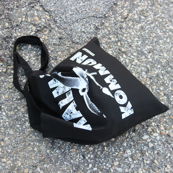 Malmö kommun i vitt screentryck på svart ekolgisk tygpåse Tack att du stöttar oss på Gudagrant, du är bäst.